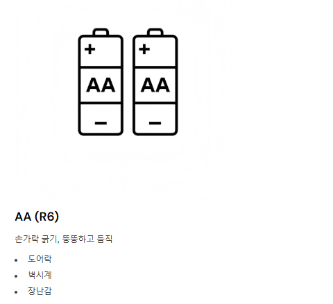 - AA (R6): 손가락 굵기 정도입니다. 도어락, 벽시계, 장난감 등에 가장 널리 쓰이는 '표준 사이즈'입니다.