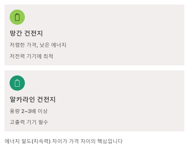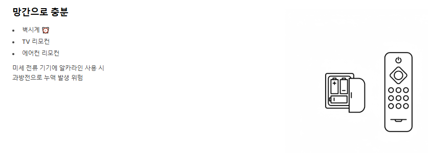 | 망간 | 낮음 | 저렴 | 벽시계, TV/에어컨 리모컨 | 고출력 기기 사용 시 작동 불가 |