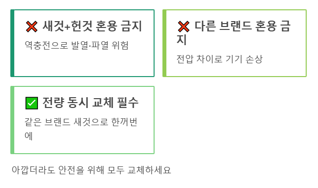 Tip (안전 경고) : 새 건전지와 헌 건전지를 섞어 쓰면 '역충전' 현상으로 발열이나 파열이 일어날 수 있습니다.
