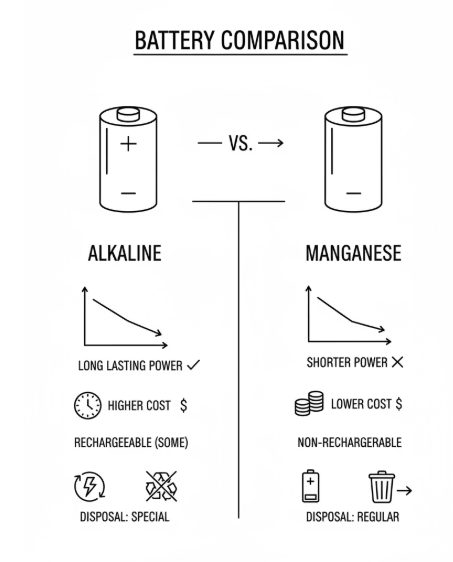 - 도어락, 장난감, 카메라 플래시: 무조건 '알카라인'을 써야 합니다. 모터를 돌리거나 강한 전력이 필요하기 때문입니다. 여기에 망간을 쓰면 며칠 못 가 멈추거나, 겨울철 전압 저하로 오작동합니다.