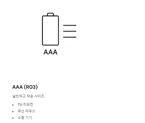- AAA (R03): AA보다 훨씬 얇고 작습니다. TV 리모컨, 무선 마우스 등 가벼운 소형 기기에 주로 들어갑니다.