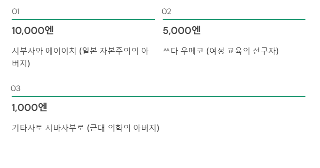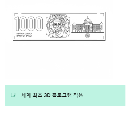 - 10,000엔 (만 엔): 기존 '후쿠자와 유키치'에서 일본 자본주의의 아버지 '시부사와 에이이치'로 변경되었습니다. (세계 최초 3D 홀로그램 적용)