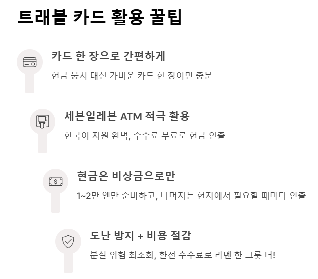 - 현금 뭉치 대신 트래블 카드를 쓰면 환전 수수료와 ATM 수수료를 아껴 맛있는 라멘 한 그릇 더 먹을 수 있습니다.