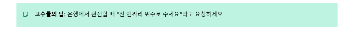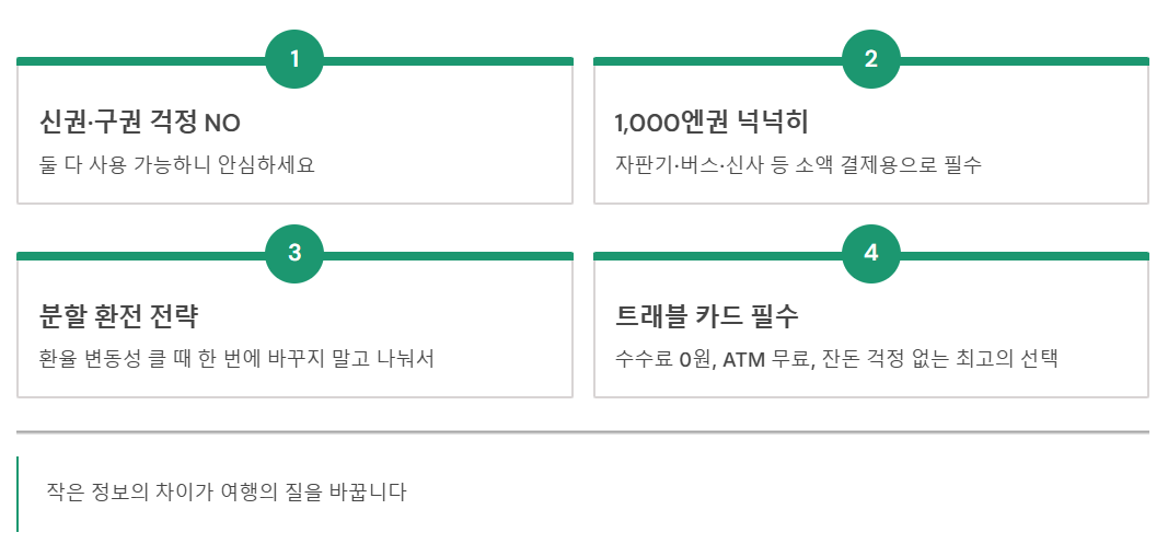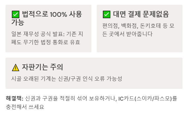 - 해결책: 여행 시 신권과 구권을 적절히 섞어 보유하거나, IC카드(스이카/파스모)를 충전해서 쓰는 것이 가장 안전합니다.