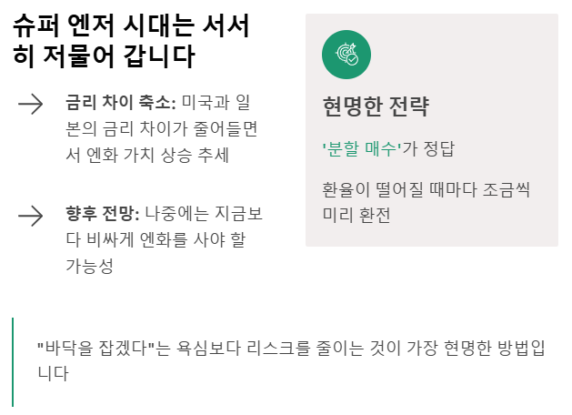 - 상승 요인: 미국과 일본의 금리 차이가 줄어들면서 엔화 가치가 오르는 추세입니다. 즉, 나중에는 지금보다 비싸게 엔화를 사야 할 수도 있습니다.
