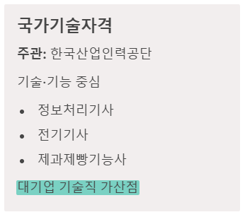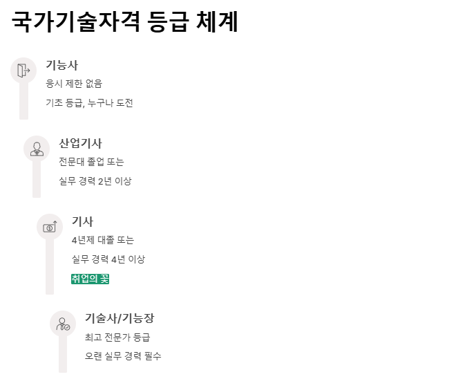 - 기사: 4년제 대졸(예정)자 혹은 실무 경력 4년 이상이어야 합니다. 기업에서 가장 선호하는 '취업의 꽃'입니다.