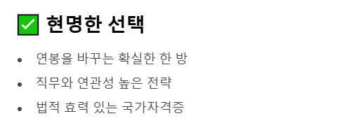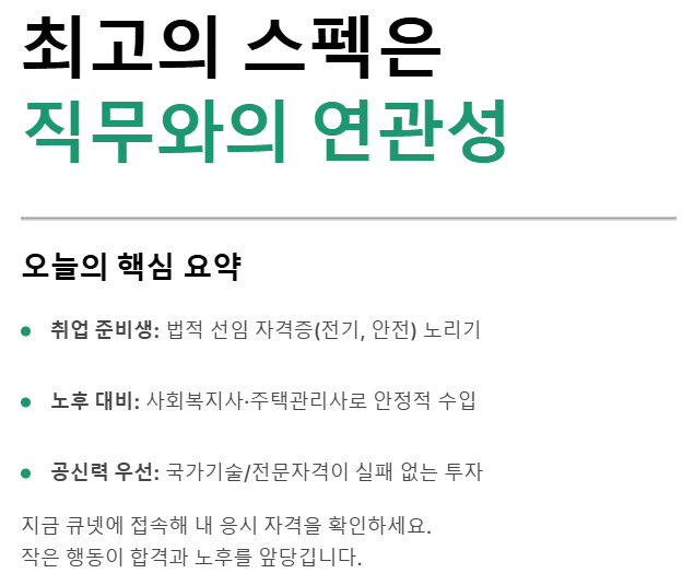 - 민간 자격증보다는 공신력이 확실한 국가기술/전문자격 위주로 준비하는 것이 실패 없는 투자입니다.
