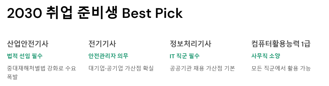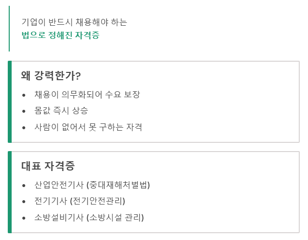 - 산업안전기사 & 전기기사: 중대재해처벌법 강화로 안전/전기 관리자 선임이 의무화되었습니다. 사람이 없어서 못 구하는 자격증으로, 취득 시 몸값이 즉시 상승합니다.