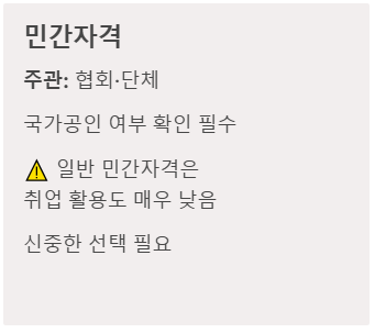 - 민간자격: 협회나 단체에서 발급합니다. '국가공인'을 받지 않은 일반 민간자격은 취업 활용도가 매우 낮으므로 신중해야 합니다.