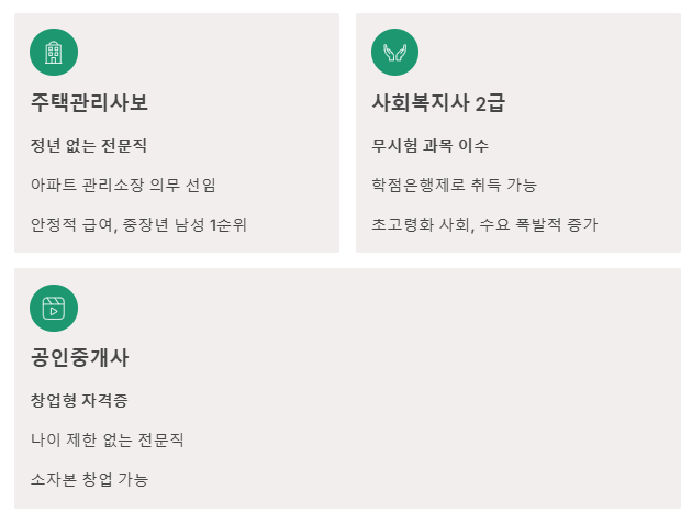 - 노후 대비는 시험 부담이 적은 사회복지사나 전문직인 주택관리사가 안정적입니다.