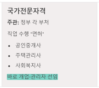 - 국가전문자격 (각 정부 부처 주관): 특정 직업을 수행하기 위한 '면허'에 가깝습니다. (예: 공인중개사, 주택관리사, 사회복지사). 취득하면 바로 개업하거나 해당 직무의 관리자로 선임될 수 있어 전문성이 높습니다.