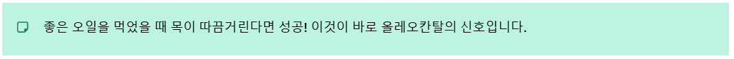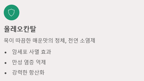 - 천연 소염제 (올레오칸탈): 좋은 오일을 먹었을 때 목이 따끔거리는 매운맛을 느꼈다면 성공입니다. 이 '올레오칸탈' 성분은 암세포를 사멸시키고 체내 만성 염증을 억제하는 강력한 항암 작용을 합니다.