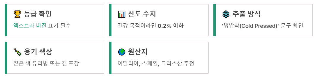 Tip: 투명한 병에 든 제품은 피하세요. 올리브오일은 빛에 닿는 순간 산패가 시작됩니다.