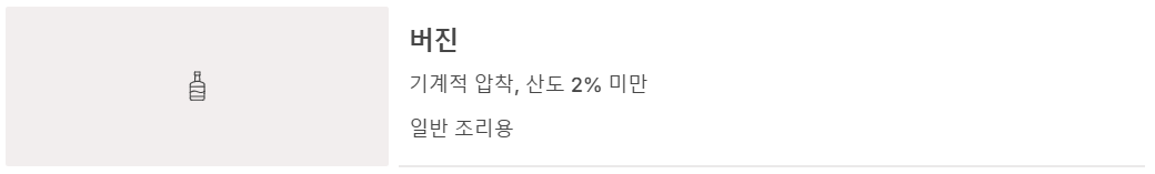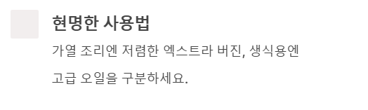 | 퓨어 (Pure) | 정제유 + 버진 혼합 | 1.5% 내외 | 튀김, 고온 요리 | 업소용, 대량 조리 |