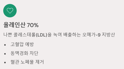 - 나쁜 콜레스테롤(LDL) 청소: 전체 지방의 70% 이상을 차지하는 올레인산(오메가-9)은 혈관에 낀 노폐물을 녹여 배출합니다. 고혈압, 동맥경화 예방에 탁월합니다.