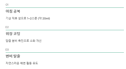 - 아침 공복 20ml 섭취는 변비와 독소 배출에 탁월하지만, 과식은 금물입니다.