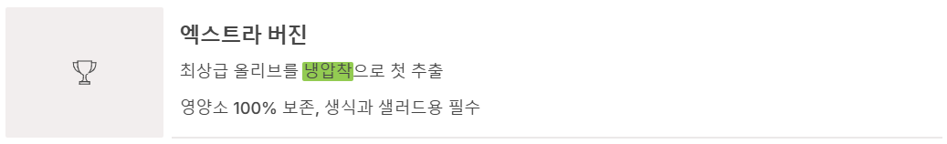 | 엑스트라 버진 | 냉압착 (Cold Pressed) | 0.8% 미만 | 샐러드, 공복 섭취, 가벼운 조리 | 건강 관리, 다이어트 |