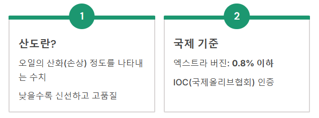 - 산도란?: 오일이 얼마나 산화(손상)되었는지를 나타내는 수치입니다. 낮을수록 신선한 오일입니다.