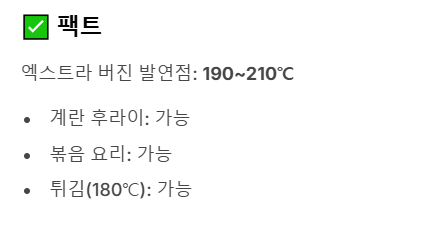 - 과학적 팩트: 최상급 엑스트라 버진의 발연점은 190~210℃입니다. 일반적인 가정 요리(계란 후라이, 볶음)는 물론 튀김(보통 180℃)도 충분히 가능합니다. 산화 안정성이 높아 식용유보다 오히려 안전합니다.