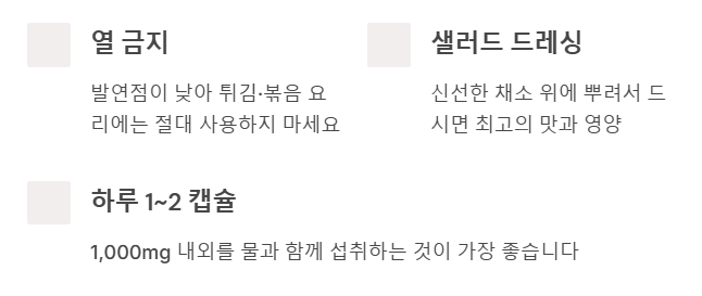 - 먹는 법: 발연점이 낮아 열을 가하는 요리(튀김, 볶음)에는 절대 사용 금지입니다. 샐러드드레싱으로 뿌려 드시거나, 하루 1~2 캡슐(1,000mg 내외)을 물과 함께 드시는 것이 가장 좋습니다.