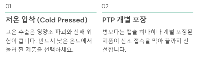 - PTP 개별 포장: 병에 든 제품보다 캡슐 하나하나 개별 포장된 것이 산소 접촉을 막아 끝까지 신선합니다.