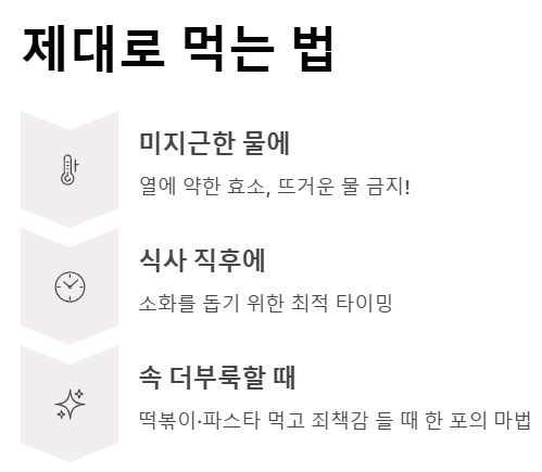 - 타이밍: 소화를 돕기 위해 식사 직후나 속이 가장 더부룩할 때 드시는 것이 베스트입니다.
