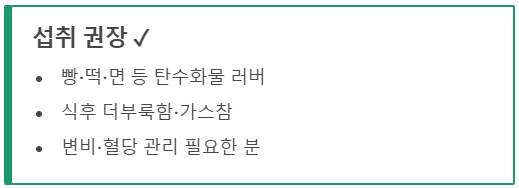 | 체질 | 변비가 있거나 혈당 관리가 필요한 분 | 특이 체질 (과다 섭취 시 복통, 설사) |