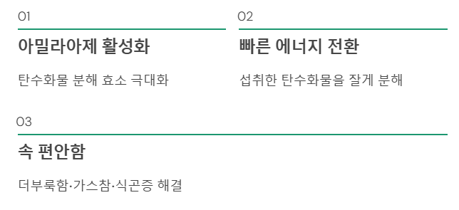 곡물을 발효시켜 만든 효소는 '아밀라아제(탄수화물 분해 효소)'의 활성도를 극대화합니다.
