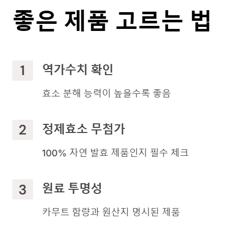 - 역가수치와 정제효소: 역가수치(효소 분해 능력)가 높을수록 좋지만, 인위적으로 수치를 높이기 위해 '정제효소(화학적 첨가물)*를 넣은 제품은 피하세요. 100% 자연 발효로 만들어진 제품인지 확인하는 것이 핵심입니다.