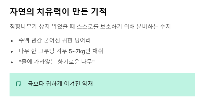 - 희소성: 나무 한 그루에서 고작 5~7kg 정도만 채취할 수 있습니다. "물에 가라앉는 향기로운 나무"라 하여 예로부터 금보다 귀하게 여겨졌습니다.