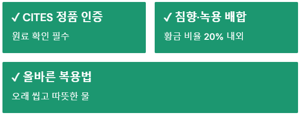 - 팁: 무조건 함량이 높다고 좋은 게 아닙니다. 침향은 약성이 강해 100%로 먹기 힘듭니다. 침향 함량 20% 내외에 녹용과 당귀가 배합된 제품이 효능과 흡수율 면에서 가장 이상적입니다. 반드시 정식 수입된 CITES 인증 원료인지 확인하세요.