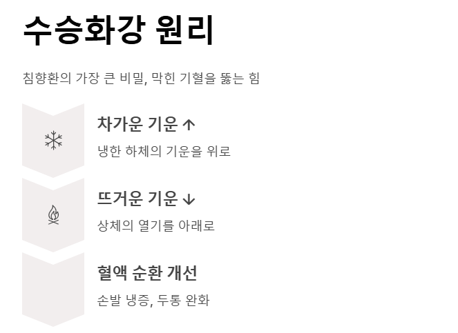 - 혈액 순환 (수승화강): 차가운 기운은 위로 올리고, 뜨거운 기운은 아래로 내려준다는 뜻입니다. 상체에 열이 몰려 머리가 아프거나, 하체가 차가워 손발이 시린 분들의 기혈 순환을 돕습니다.