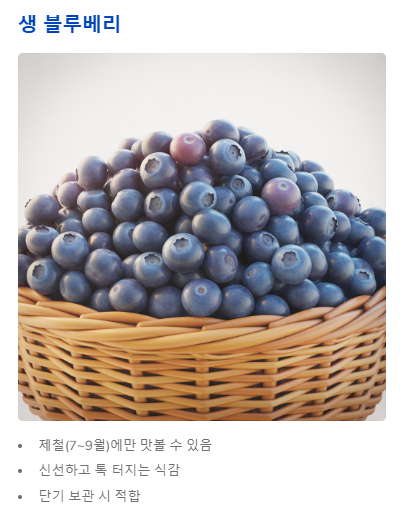 | 생 블루베리 | 제철(7~9월)에만 맛볼 수 있음 | 신선하고 톡 터지는 식감이 일품 |