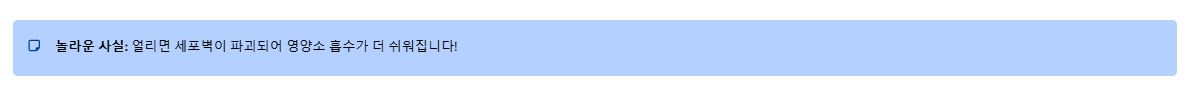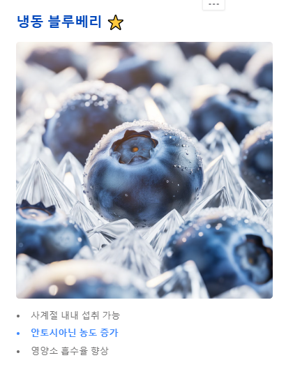| 냉동 블루베리 | 사계절 내내 섭취 가능 | 안토시아닌 농도가 오히려 증가함 |