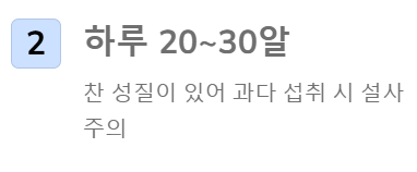 - 하루 권장량은 20~30알이며, 찬 성질이 있어 과다 섭취 시 설사를 할 수 있습니다.