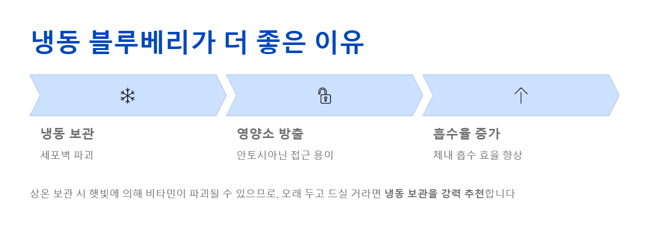 - 왜 냉동이 좋을까?: 블루베리를 얼리면 단단한 세포벽이 파괴되면서, 우리 몸이 영양소를 흡수하기 훨씬 쉬운 상태가 됩니다. 게다가 상온 보관 시 햇빛에 의해 비타민이 파괴될 수 있으므로, 오래 두고 드실 거라면 냉동 보관을 강력 추천합니다!