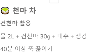 - 방법: 물 2L에 건천마 30g, 대추, 생강을 넣고 40분 이상 푹 끓입니다. 대추와 생강이 비릿한 향을 중화시켜 줍니다.