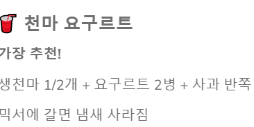- 레시피: 생천마 1/2개 + 요구르트 2~3병 + 사과 반쪽