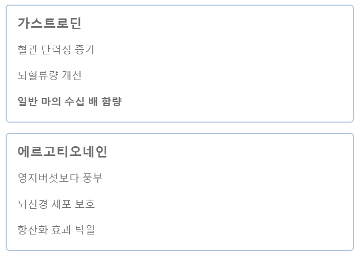 | 주효능 | 위장 보호, 자양강장 | 뇌혈관 질환(중풍), 두통, 마비 |