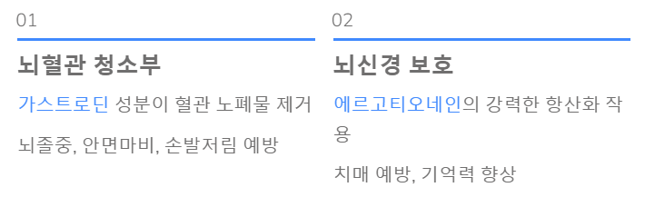 핵심 성분인 '가스트로딘(Gastrodin)'은 혈관 내벽에 쌓인 노폐물을 청소하고 혈관 탄력성을 높여줍니다.