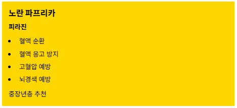 | 노랑 🟡 | 피라진 | 혈액 순환, 혈관 질환 예방. 혈액 응고를 막아 고혈압, 뇌경색 예방에 도움을 줍니다. (중장년층 추천) |