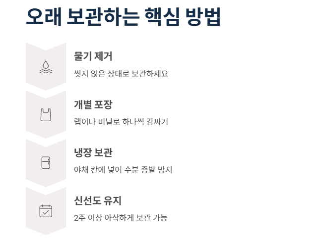 - 물기 제거: 물기가 닿으면 금방 상합니다. 씻지 않은 상태로 보관하세요.