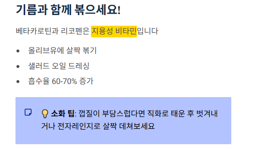- 기름에 살짝 볶아 먹어야 영양 흡수율이 훨씬 높아집니다.