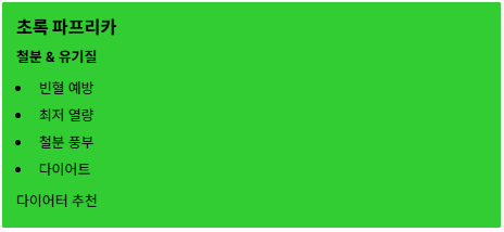| 초록 🟢 | 철분, 유기질 | 빈혈 예방, 다이어트. 열량이 가장 낮고 철분이 풍부합니다. (다이어터 추천) |