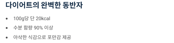 수분 함량이 90% 이상이라 운동 후 갈증 해소에도 좋고, 아삭한 식감이 포만감을 주어 다이어트 간식으로 최고입니다.