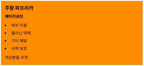 | 주황 🟠 | 베타카로틴 | 피부 미용, 눈 건강. 멜라닌 생성을 억제해 기미 예방 및 시력 보호에 탁월합니다. (여성분들 추천) |