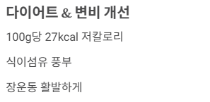 100g당 27kcal로 열량이 매우 낮고, 수분과 식이섬유가 풍부해 포만감을 줍니다.