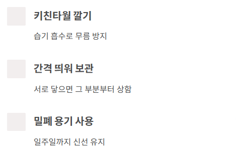 키친타월을 깔고 간격을 띄워 밀폐 용기에 보관하면 일주일도 거뜬합니다.