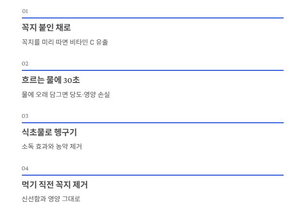 물에 30초 이상 담가두면 당도와 비타민이 빠져나갑니다. 흐르는 물에 가볍게 씻은 뒤,