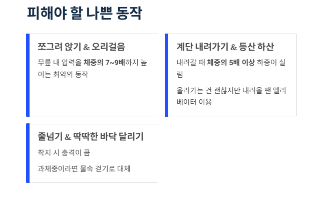 - 줄넘기 & 딱딱한 바닥 달리기: 착지 시 충격이 큽니다. 과체중이라면 줄넘기 대신 위에서 소개한 물속 걷기 같은 무릎관절에 좋은 운동을 선택하세요.